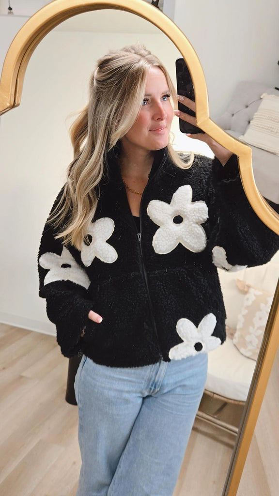 Snuggle up in pure comfort with the Cozy Blooms Sherpa Jacket—your new favorite go-to for those lazy days and outdoor adventures alike. This adorable jacket wraps you in incredibly soft sherpa that feels like being hugged by a cloud, making it the ultimate cozy companion. Perfect for layering or wearing solo, it's designed to keep you warm and comfy without sacrificing style. Find your perfect match in white or choose from our other delightful color options. Once you slip it on, you won't want to take it off!